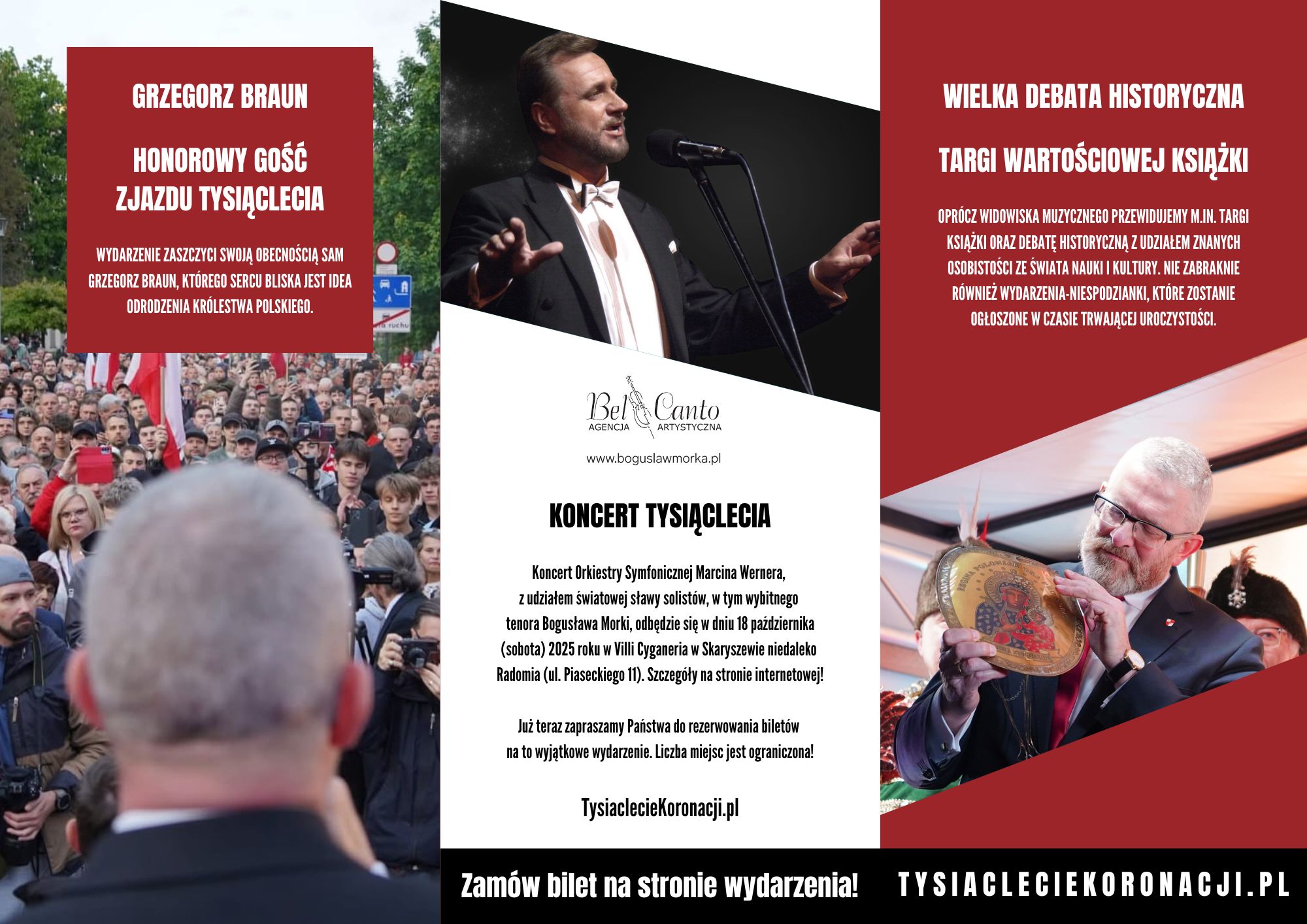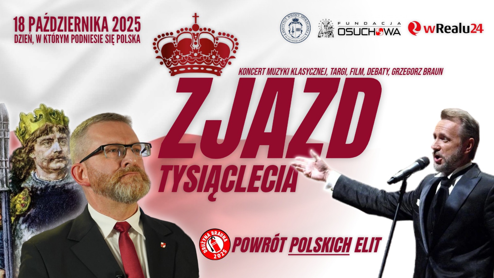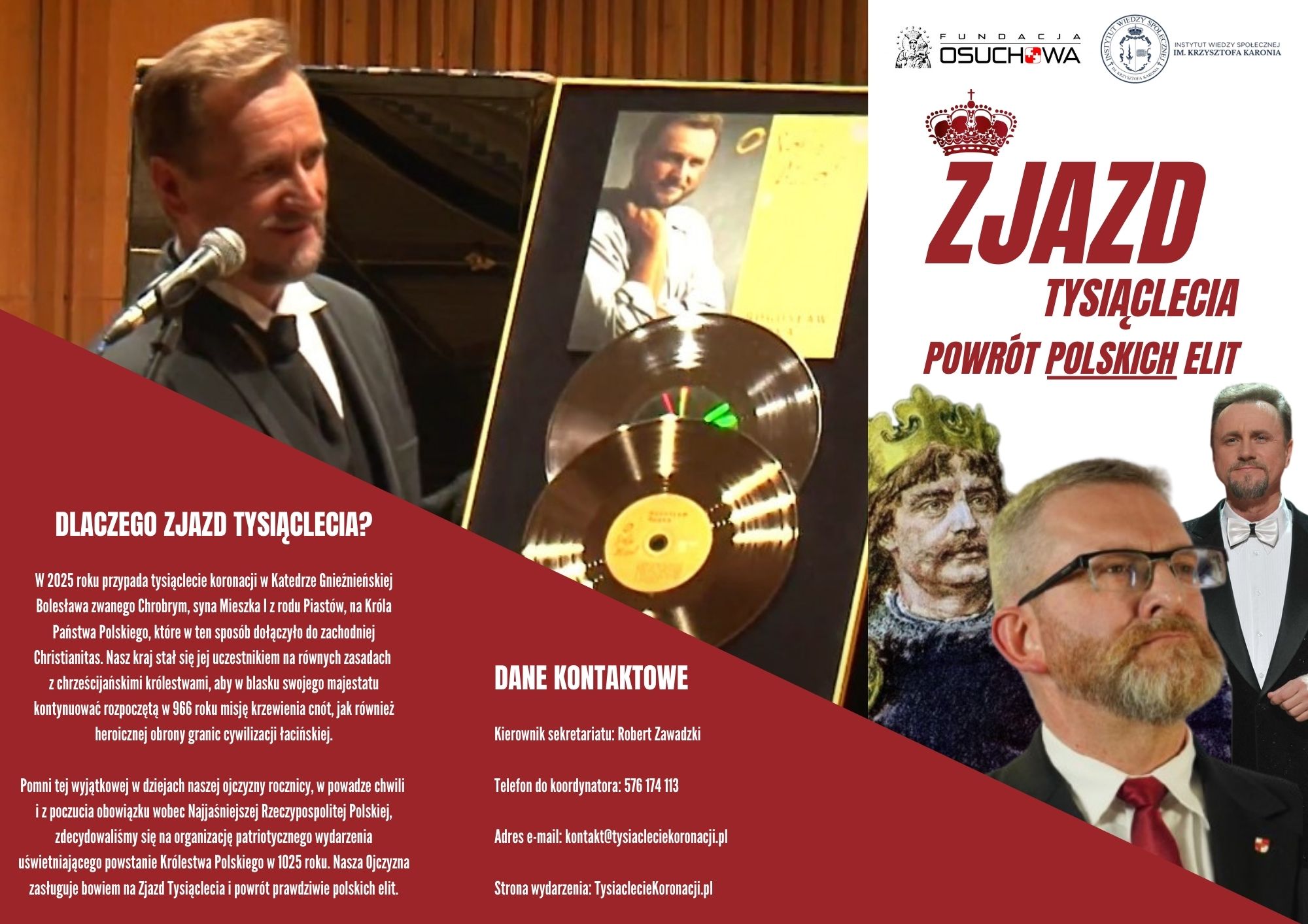 To właśnie wtedy zdobywca Kijowa Bolesław Chrobry stanął na równi z pozostałymi monarchami europejskimi. I komu to przeszkadzało? Czy Polska znowu może być wielka? Kto ma tego dokonać? Kto jak nie my i nie Grzegorz Braun? Czas na powrót polskich elit. Elitę wykuwa natomiast kultura wysoka, która wydaje się w ostatnich latach celowo zaniedbywana przez rządzące Polską siły. Pomni tej wyjątkowej w dziejach naszej ojczyzny rocznicy, w powadze chwili i z poczucia obowiązku wobec Najjaśniejszej Rzeczypospolitej Polskiej, zdecydowaliśmy się na organizację patriotycznego wydarzenia uświetniającego powstanie Królestwa Polskiego w 1025 roku. Nasza Ojczyzna zasługuje bowiem na Zjazd Tysiąclecia i powrót prawdziwie polskich elit.